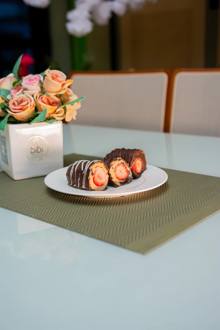 Delicioso bombom aberto recheado com creme de Ninho, uva ou morango frescos e finalizado com brigadeiro de chocolate. Uma sobremesa deliciosa e surpreendente, que combina a suavidade do chocolate.